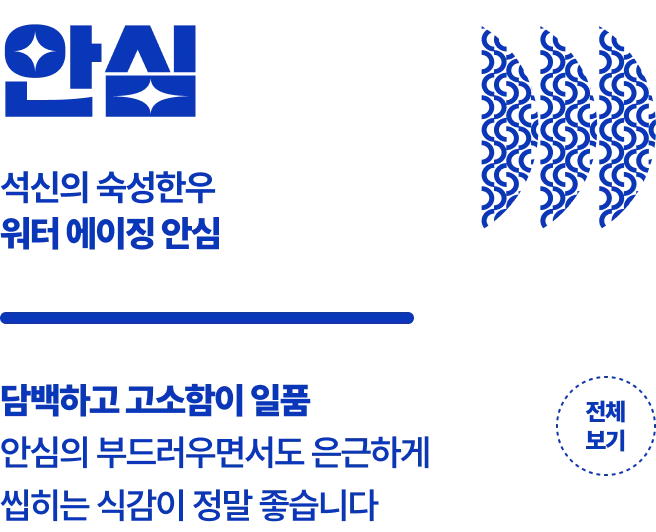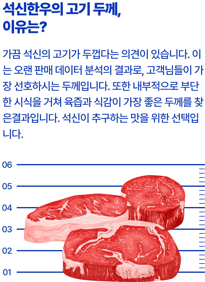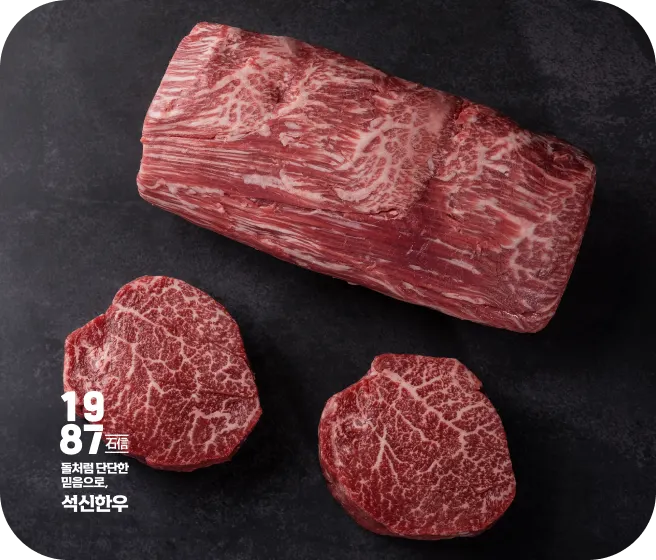 석신한우 숙성육의 장점은 다양한 컨디션의 원육이 가지는 맛의 편차를 최대한 줄이고 농축된 단백질은 감칠맛을 끌어 올려줍니다. 석신의 워터에이징 안심에 대한 고객들의 만족도는 매우 높으며, 풍부한 육즙과 풍미로 기존 안심과는 다른 특별한 맛이라는 평가를 받고있습니다.